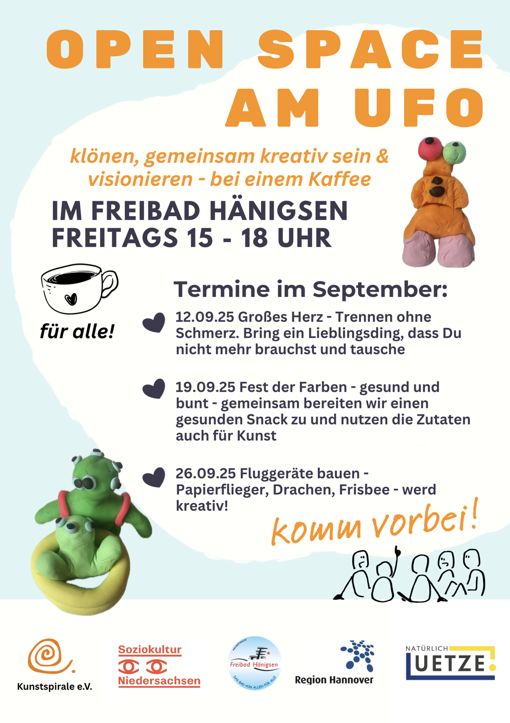 Z.B. ist jeden Freitag der Open Space am UFO - Klönen, Kreativ sein, Visionieren. Im September treffen wir uns von 15 - 18.00 Uhr am UFO. Bei einem Kaffee und bei jeweils einer kleinen Aktion kommen wir zusammen.