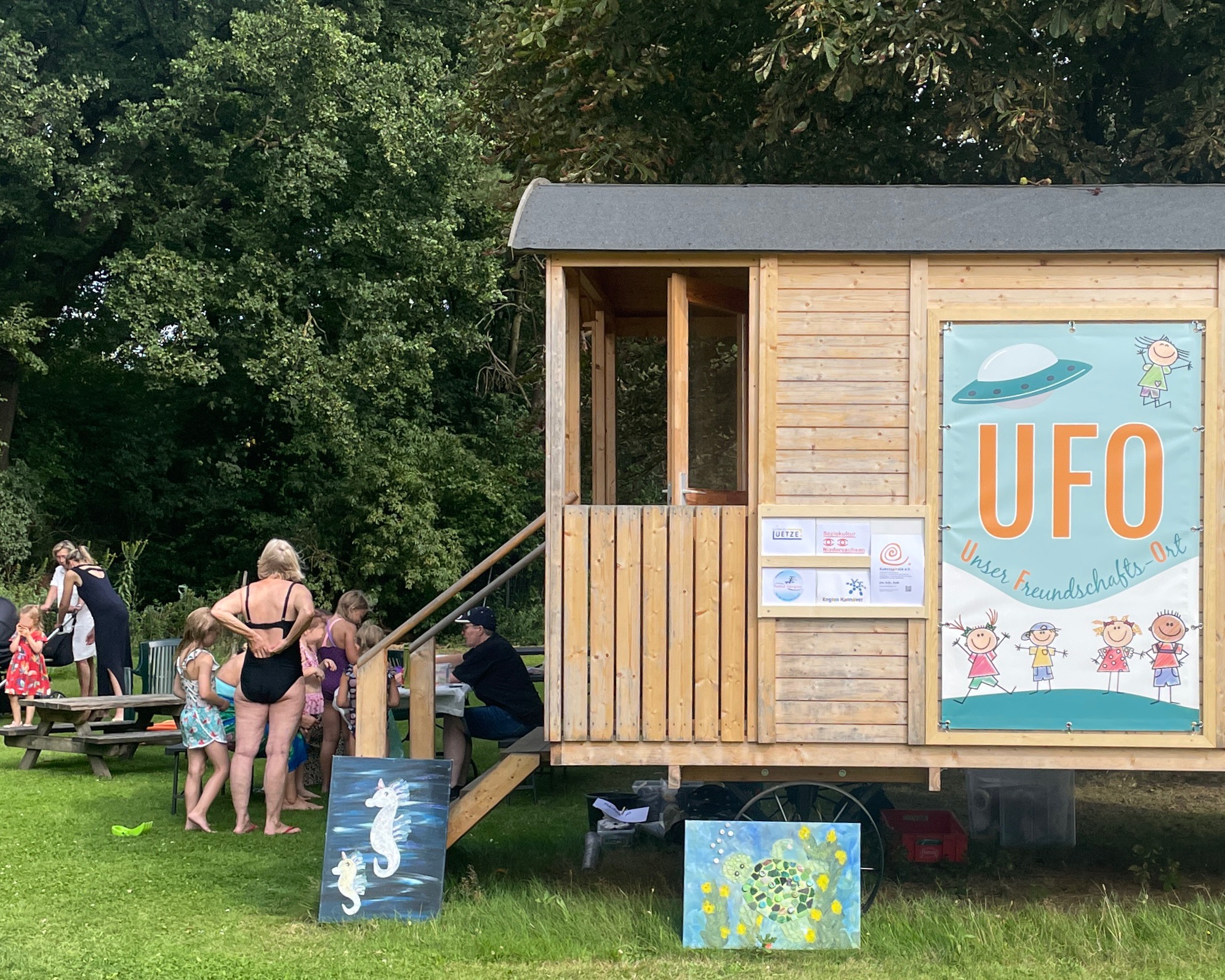 Der Landesverband Soziokultur, die Region Hannover und die Gemeinde Uetze fördern das Projekt UFO und ermöglichen so, dass der Bauwagen und die Wiese auf dem Freibadgelände zum Miteinander einlädt.